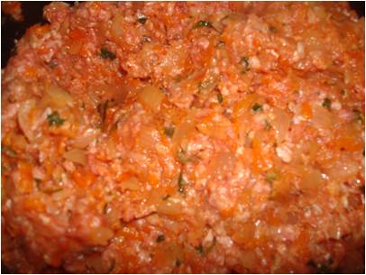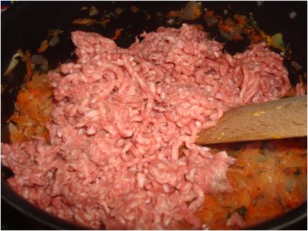 3. A fuoco spento unite al composto di cipolla la carne