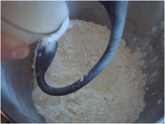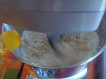 1. Nell'impastatrice unite la farina con il lievito sciolto nell'acqua..