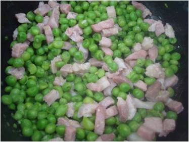 2. Ora fatte rosolare la pancetta assieme ai piselli.